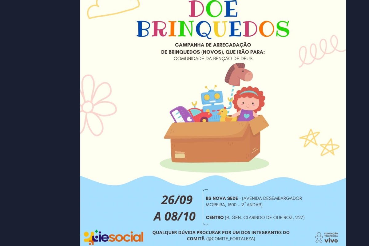 Doar brinquedos para que sejam entregues para as crianças do IE Social, que trabalha com as crianças do entorno na região do Maracanaú.Participe da nossa campanha de arrecadação de brinquedos e transforme o sorriso de uma criança! Sua doação vai proporcionar momentos de felicidade e diversão às crianças atendidas pelo IE Social, uma instituição que trabalha com a comunidade do entorno do Maracanaú. Juntos, podemos fazer deste Dia das Crianças uma celebração inesquecível, repleta de amor, esperança e alegria. Contribua com seu carinho e ajude a espalhar sorrisos!